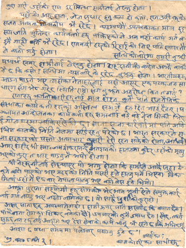Letter written by the incarcerated leaders of Praja Parishad (Shree Tanka Prasad Acharya, Shree Ram Hari Sharma, Shree Khadga Man Singh) to Dr. Regmi